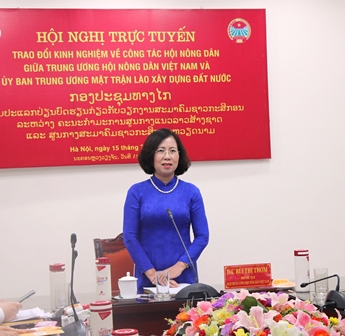 Đồng chí Bùi Thị Thơm- Phó Chủ tịch Ban Chấp hành Trung ương Hội Nông dân Việt Nam chủ trì Hội nghị trực tuyến trao đổi kinh nghiệm về công tác Hội Nông dân giữa Trung ương Hội Nông dân Việt Nam và Ủy ban Trung ương Mặt trận Lào xây dựng đất nước tại điểm cầu Trung ương Hội |